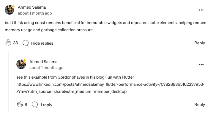 첫 번째 이미지에서 Ahmed Salama는 "const 키워드는 불변(immutable) 위젯과 반복적으로 사용되는 정적(static) 요소에 유용하다"고 주장하고 있다. const를 사용하면 메모리 사용량을 줄이고 가비지 컬렉션(GC) 부담을 낮출 수 있다는 점을 강조한다