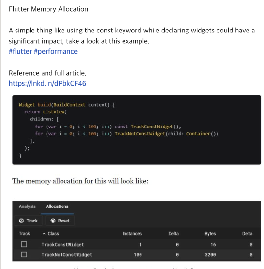 결과를 보면 const가 적용된 위젯은 오직 하나의 인스턴스만 생성되고, 이를 재사용하는 방식이라 메모리 사용량이 훨씬 적음을 알 수 있다. 반면 const 없이 TrackNotConstWidget을 사용한 경우, 100개의 개별 인스턴스가 생성되면서 메모리 소비량이 훨씬 높아진 것.. 유의미 하다고 할 수 있지요